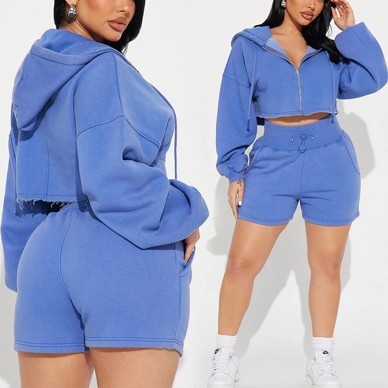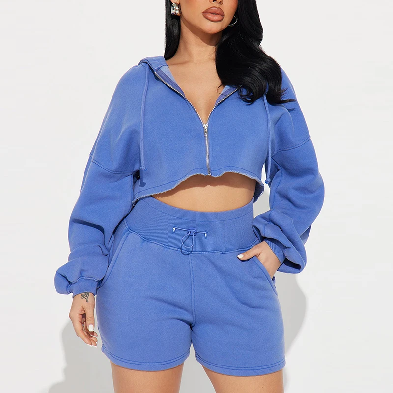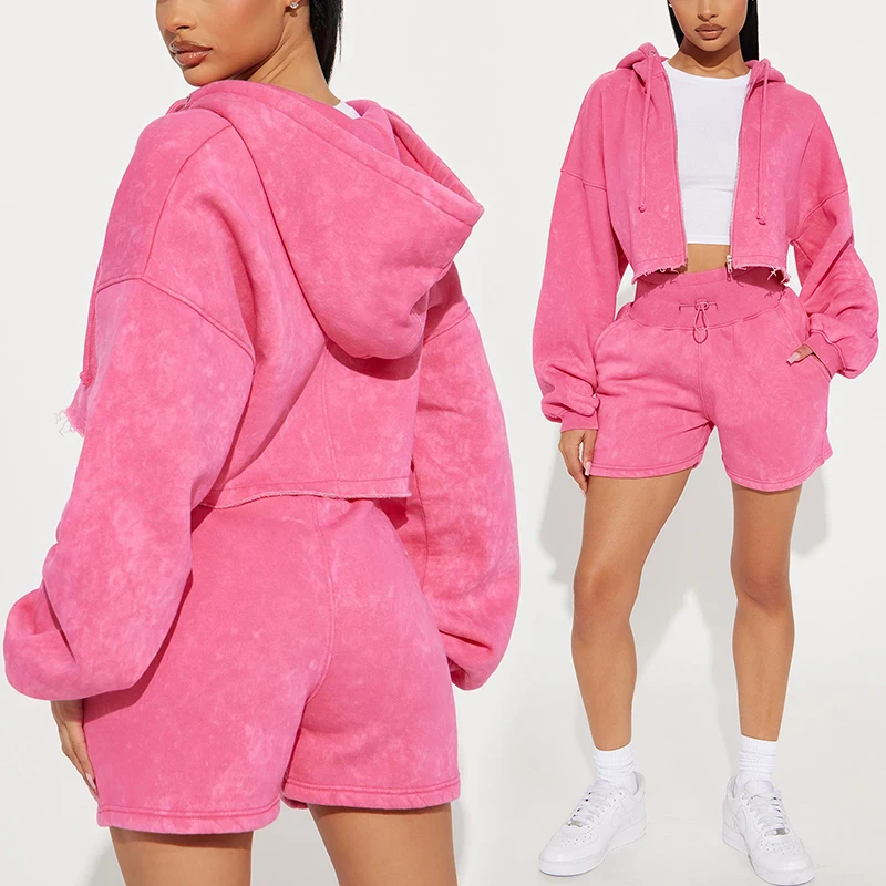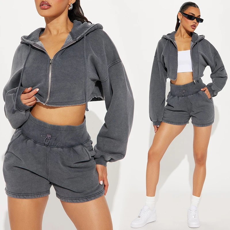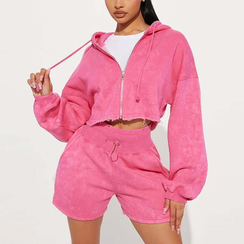 Huilil Custom Vintage Acid Washed Zip Raw Hem Crop Top Hoodie Shorts Women Two Piece Set Heavyweight 100% Cotton Terry Front